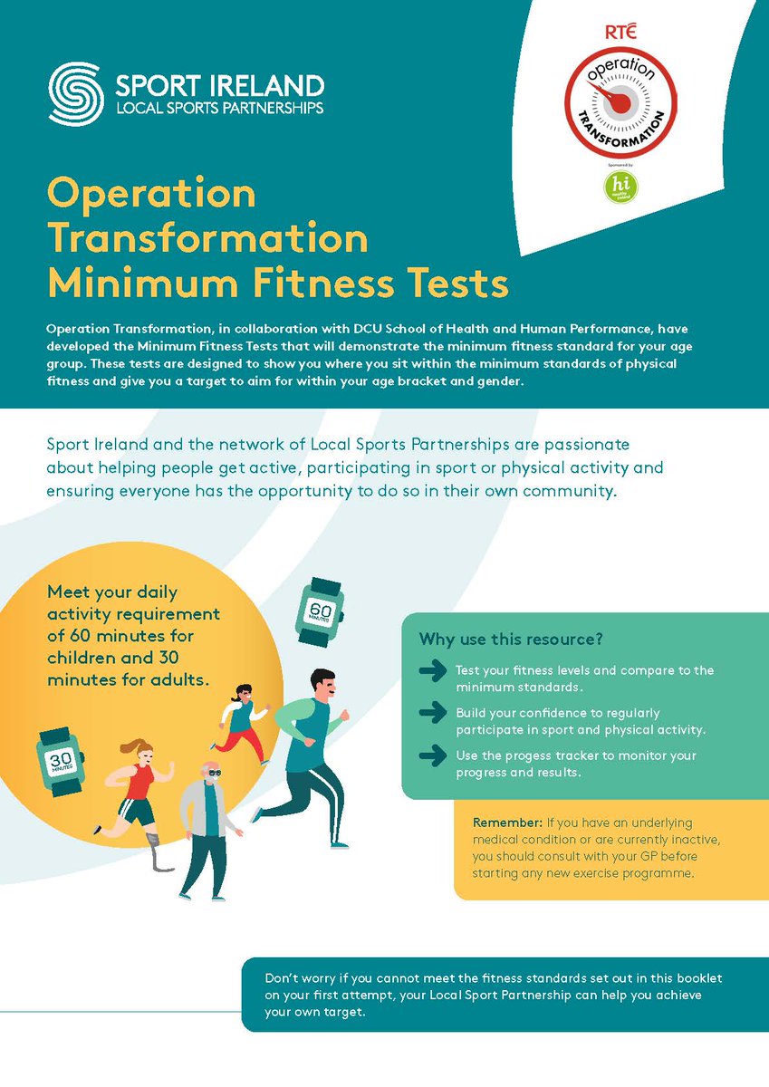 Operation Transformation 2021 Minimum Fitness Test Booklet Now Available - Here you will find instructions as to how to perform each component of the test relevant to your age and gender.